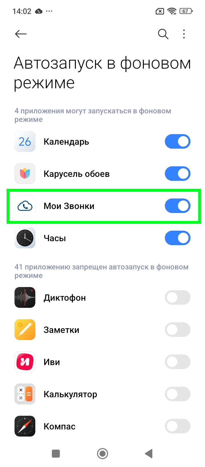 Если там будет кнопка Автозапуск в фоновом режиме (она есть не во всех обновлениях телефона, если такой нет, то пропускаем), то нажать ее, далее в новом окне в списке приложений найти и включить Мои Звонки.